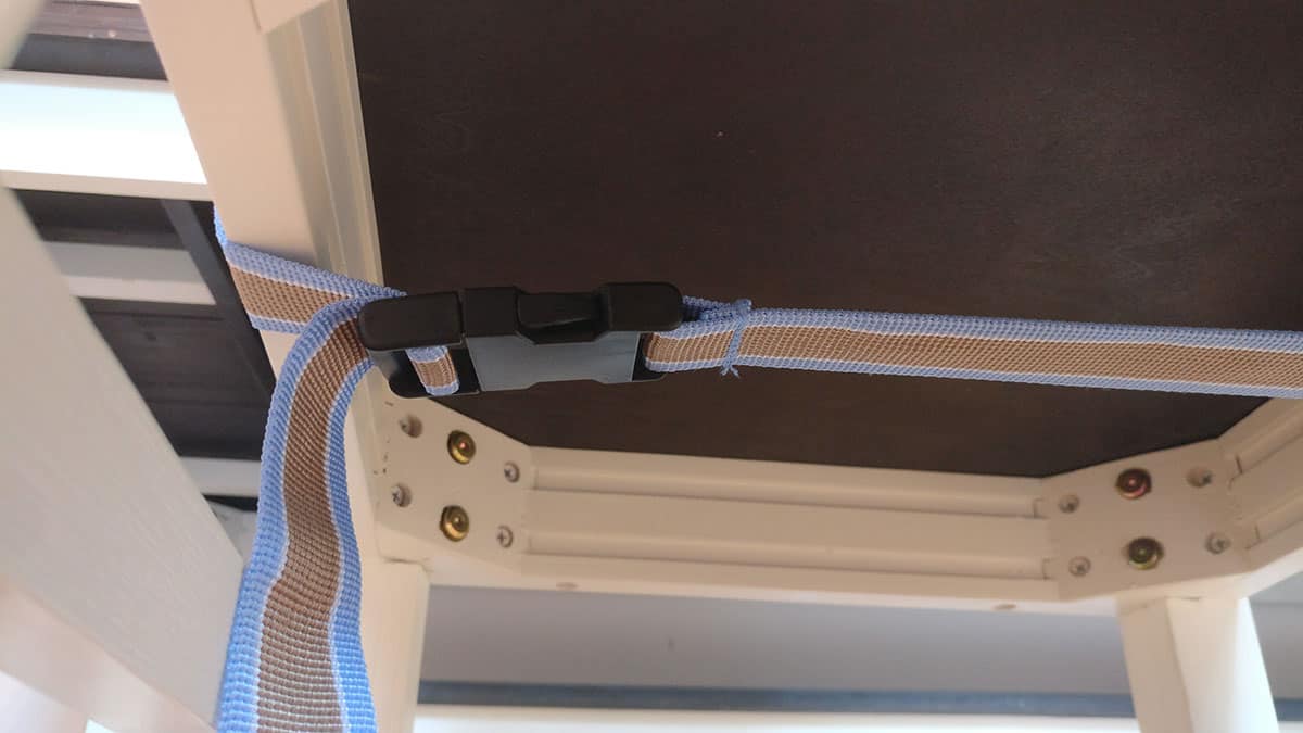 - Der zweite Gurt wird an der Unterseite einer Sitzfläche angebracht und stramm gezogen.