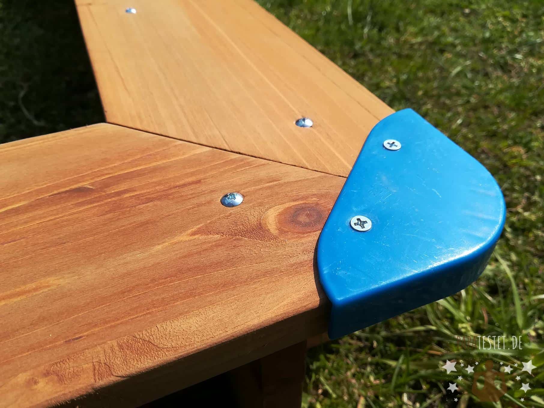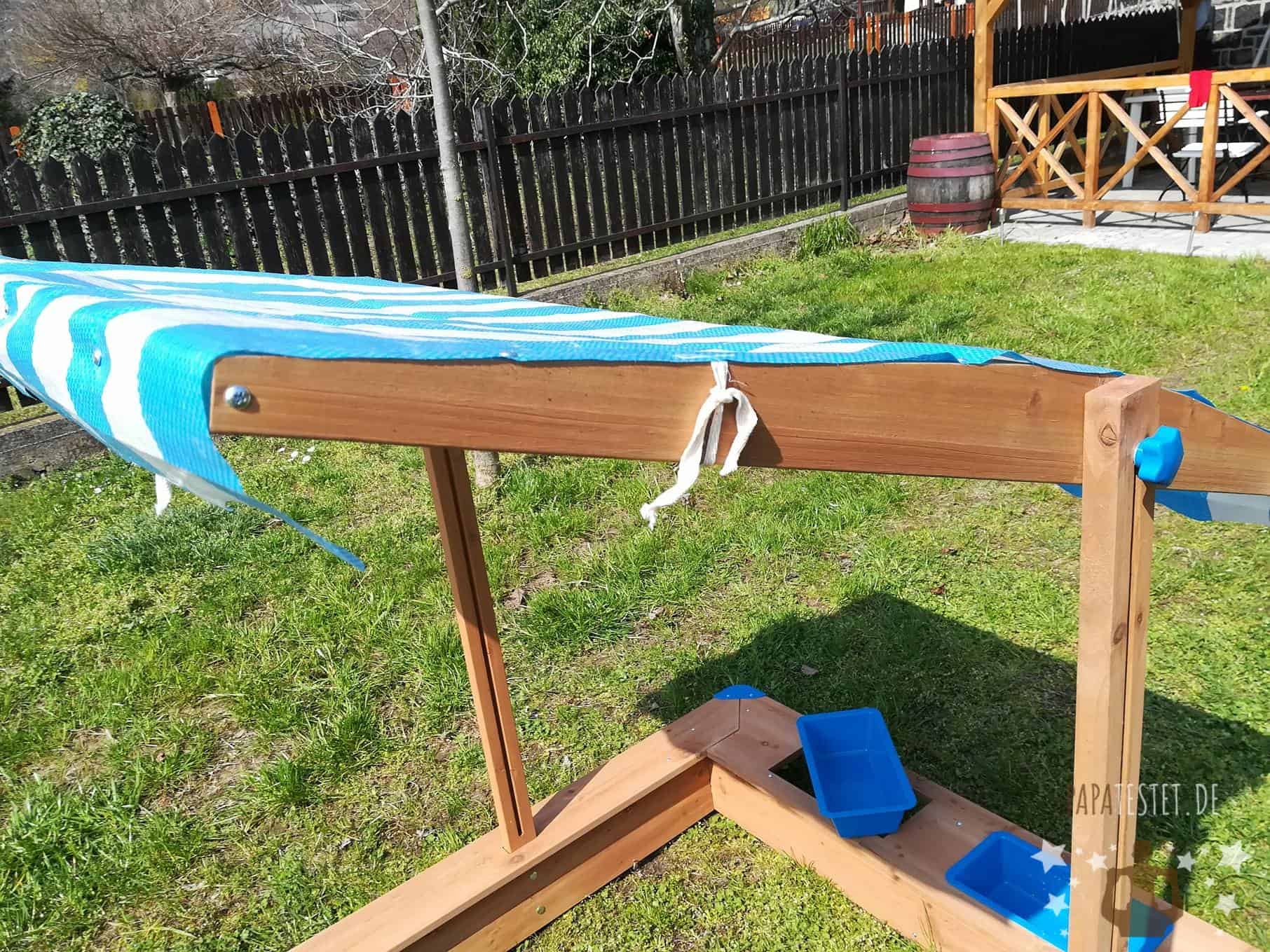 Das Dach des Lidl Sandkasten ist auch nicht unbedingt das Beste, doch in einigen Punkte wesentlich besser. Denn es hat in der Mitte einen Griff, was das Auf- und Absenken erheblich erleichtert, und zum anderen ist die Plane mit dünnen Holzleisten befestigt. Dadurch flattert die Plane nicht bei Wind stark herum, sondern ist auch bei Regen dicht. Mit dazu hat sie auch einen UV-Schutz von 80.